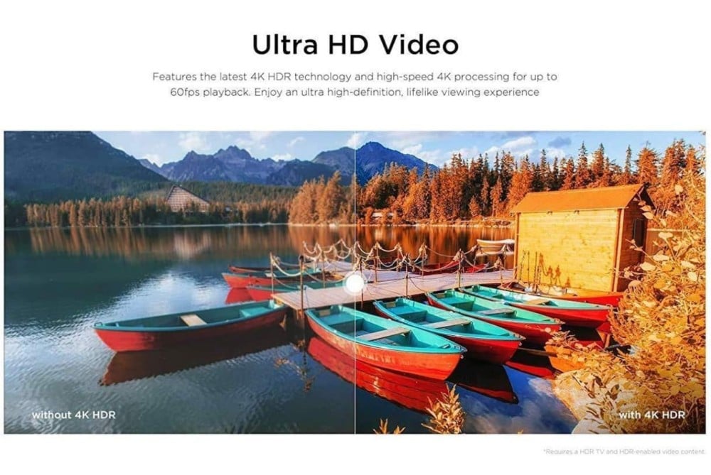 يمكنك تجربة جودة صورة واقعية بدقة 4 كيه اتش دي ار. يمكنك الوصول إلى متجر جوجل بلاي، مع اتصال واي فاي والوصول إلى الإنترنت وسهل الاستخدام للغاية مع جهاز تحكم عن بعد بلوتوث واحد يتم التحكم فيه بالصوت.