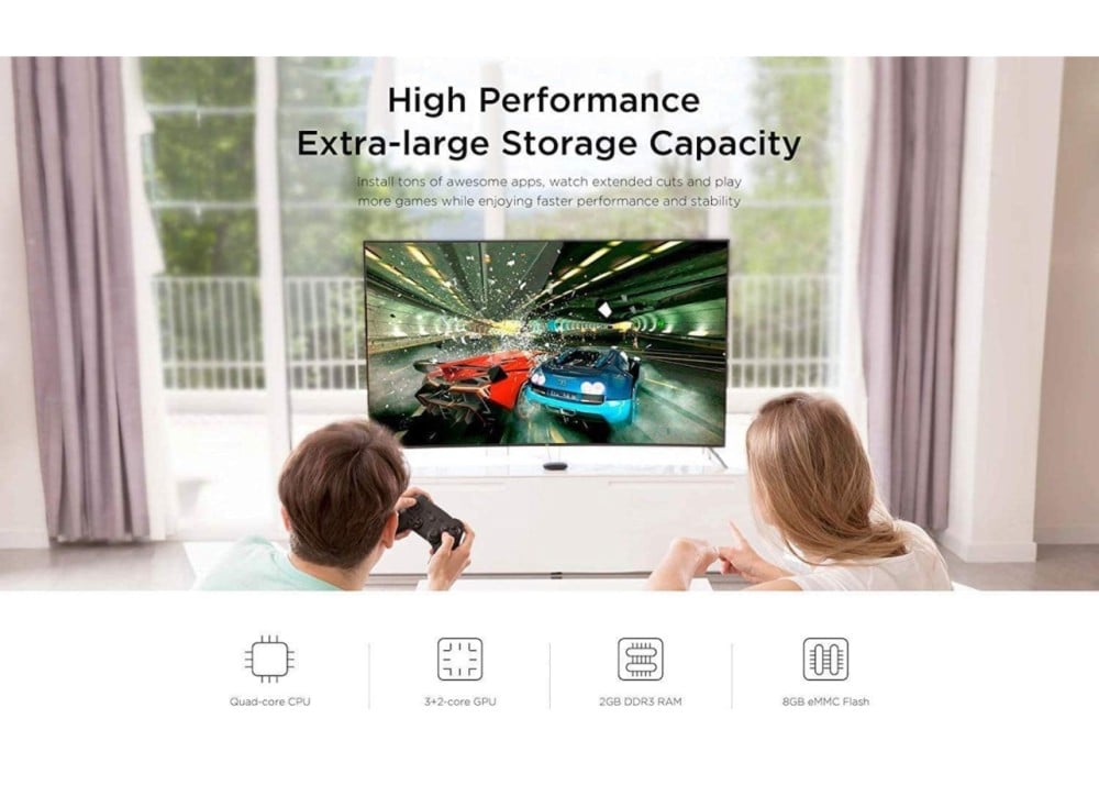 - دقة الإخراج: 4K (3840 × 2160)، وحدة المعالجة المركزية: Cortex-A53 رباعي النواة 64bit، وحدة معالجة الرسومات: Mali-450، ذاكرة الوصول العشوائي: 2GB DDR3، التخزين: 8GB eMMC، نظام التشغيل: اندرويد 8.1